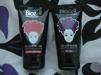 Biozellin Color Mask hoitavat sävytteet ovat punaisten ja violettien hiusvärien pelastus :). Olen jo pitkään värjäillyt hiuksiani eri punaisten ja violetin sävyillä, mutta nämä värit ovat tunnettuja nopeasta haalistumisestaan. Viimeksi olen värjännyt kuontaloni Schwarzkophin Live Color XXL 86 Pure Purplella, mutta purppura on kadonnut johonkin ja epämääräistä ruskeaa ja oranssia puskee esille. Juurikasvua ei kuitenkaan ole kuin puoli senttiä, mutta haluan kauniin värin viikonlopun "edustustehtäviin" :D. Tälläisissa tilanteissa Color Mask on oikea Jumalten lahja, sävytteen voi levittää kuiviin hiuksiin, antaa vaikuttaa 3 - 5 minuuttia ja huuhdella pois. Sävyte ei sotke tai haise ja värejä voi sekoitella keskenään. Kestää hiuksissa 6 - 8 pesua ja purtilo riittää 2 - 3 käsittelyyn puolipitkille hiuksille. Ovatko muut kokeilleet näitä sävytteitä?